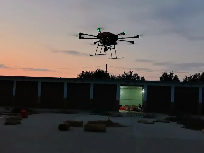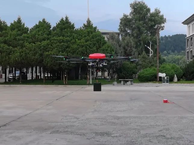 无人机吊挂50kg物资箱,飞行至目标点并悬停卸货。